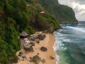 巴里島寶格麗度假別墅酒店 (Bulgari Resort Bali),公眾從地面和海洋上都無法到達懸崖與水邊之間的白色沙灘,因為它被珊瑚礁保護著。唯一的通道是使用度假村的傾斜電梯,它帶著客人在沙灘上往返,也將客人送到海灘俱樂部 (Beach Club)。這裡沒有人工開發的痕跡,吸引了成群的海豚在這片海域嬉戲,海景別墅中和海灘上的顧客都可以觀賞到這一景觀。