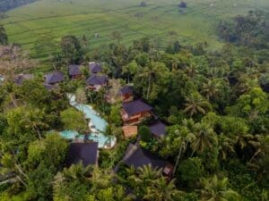 Buahan Banyan Tree Escape 位於巴厘島叢林中心的布阿罕小村莊附近,隱藏在無數層難以穿透的植物群後面,可以瞥見稻田,距離烏布北部有 40 分鐘車程。